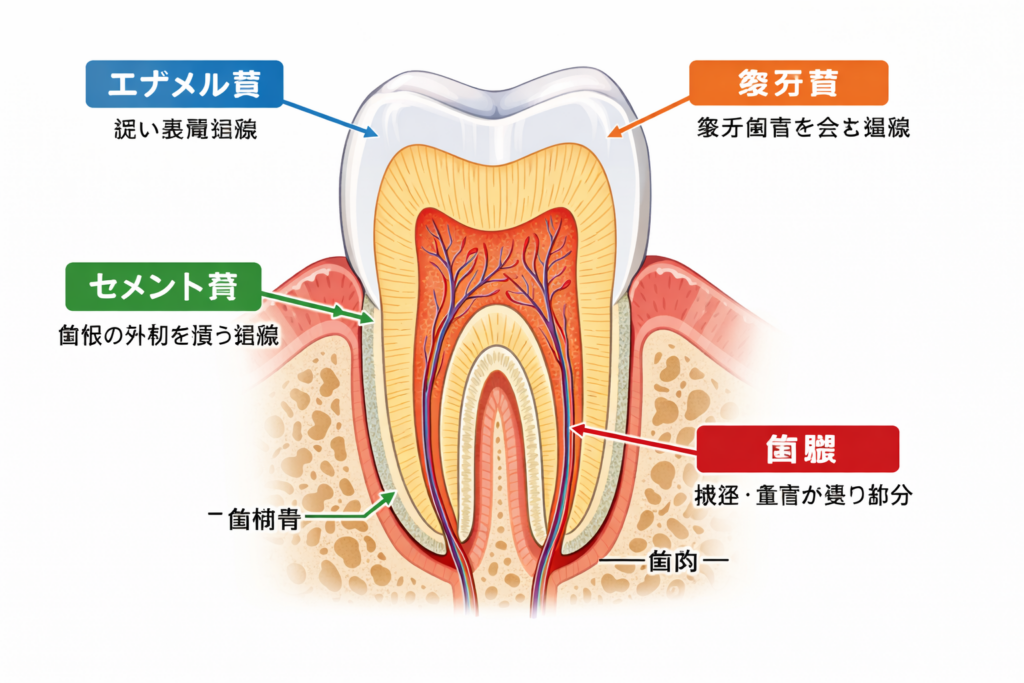 また加齢によりこの象牙質の厚みは増し、エナメル質は薄くなっていきます。