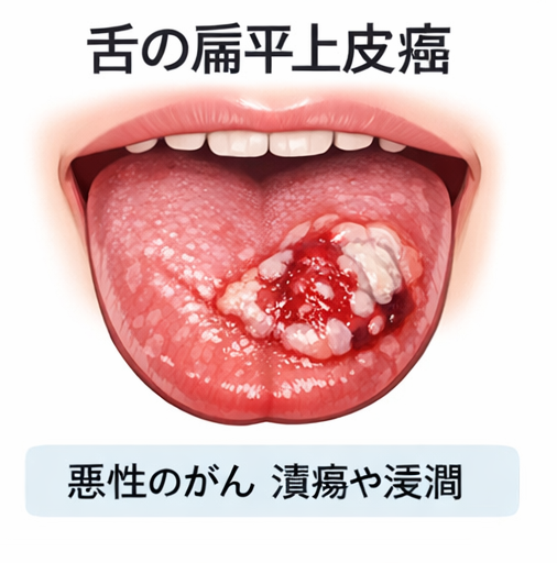 口の中で起こるがんの中で最も頻度が高いのは舌癌です。その中では扁平上皮癌がほとんどです。50代以上の男性に多いとされています。飲酒や喫煙、入れ歯による慢性的な刺激が原因として考えられています。リンパ節の転移や肺や骨への転移も起こることがあり、早期に治療することが必要です。扁平上皮癌は上皮性の腫瘍なので見た目で異常な形態をしている場合がほとんどです。色が変わったり、舌の形が部分的に変だったりする場合は早めに受診するようにしましょう。