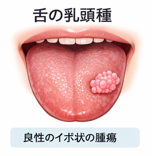 乳頭腫は舌だけでなく歯茎や口蓋にもできることがあります。表面が樹枝状やカリフラワー状になるのが典型的です。良性の腫瘍で切除することが一般的です。悪性のものではないので心配はいりませんが、切除したものは念の為に病理検査で確定診断をすることもあります。