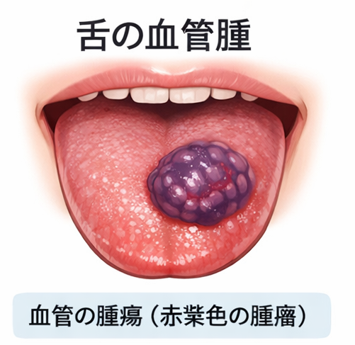 舌や口の粘膜にできるもので血管が増殖したために起こるものです。比較的若い方にもできることがあります。間違って噛んだ後にできる血豆とは異なる病態です。治療としては手術で取ることが多かったのですが、最近ではレーザーを使用した治療方法も出てきています。