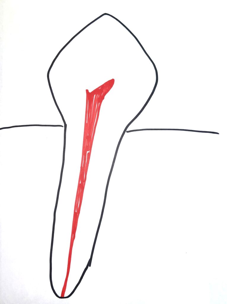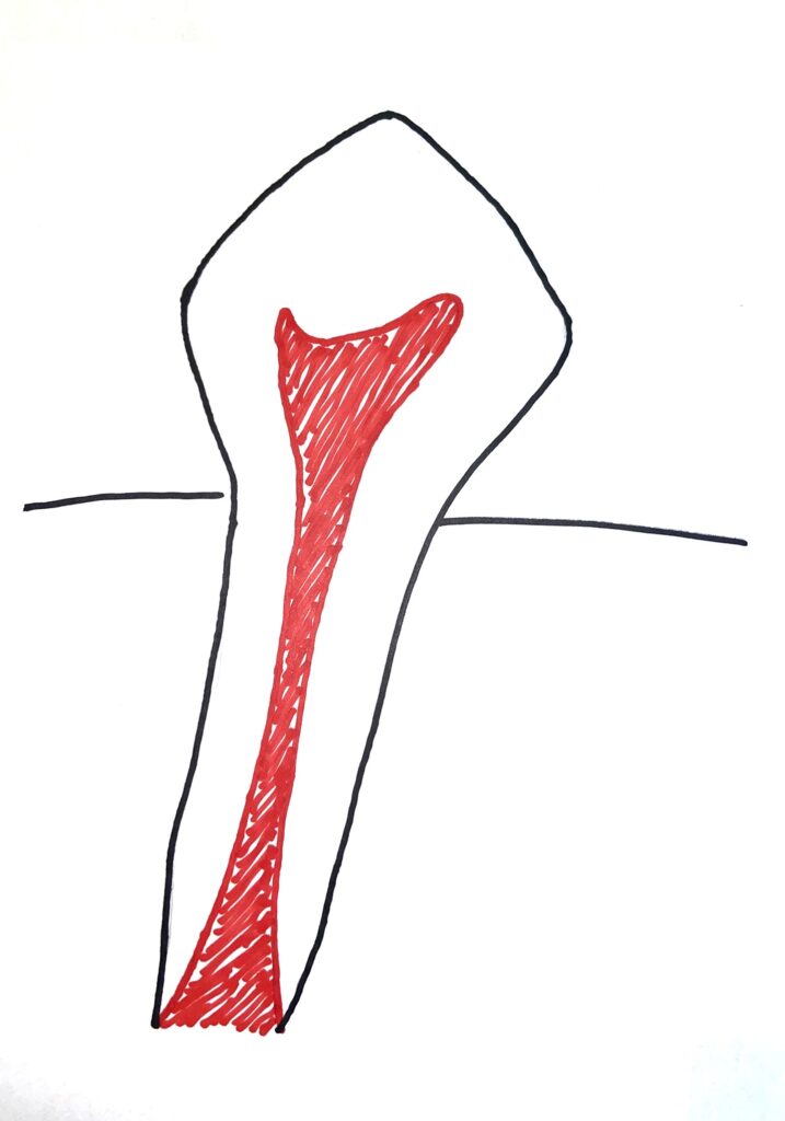 完成された永久歯の根尖では、歯髄の通っている管(根管)がだんだん細くなっていて、最後は非常に狭く締まっています(狭窄:きょうさく)。