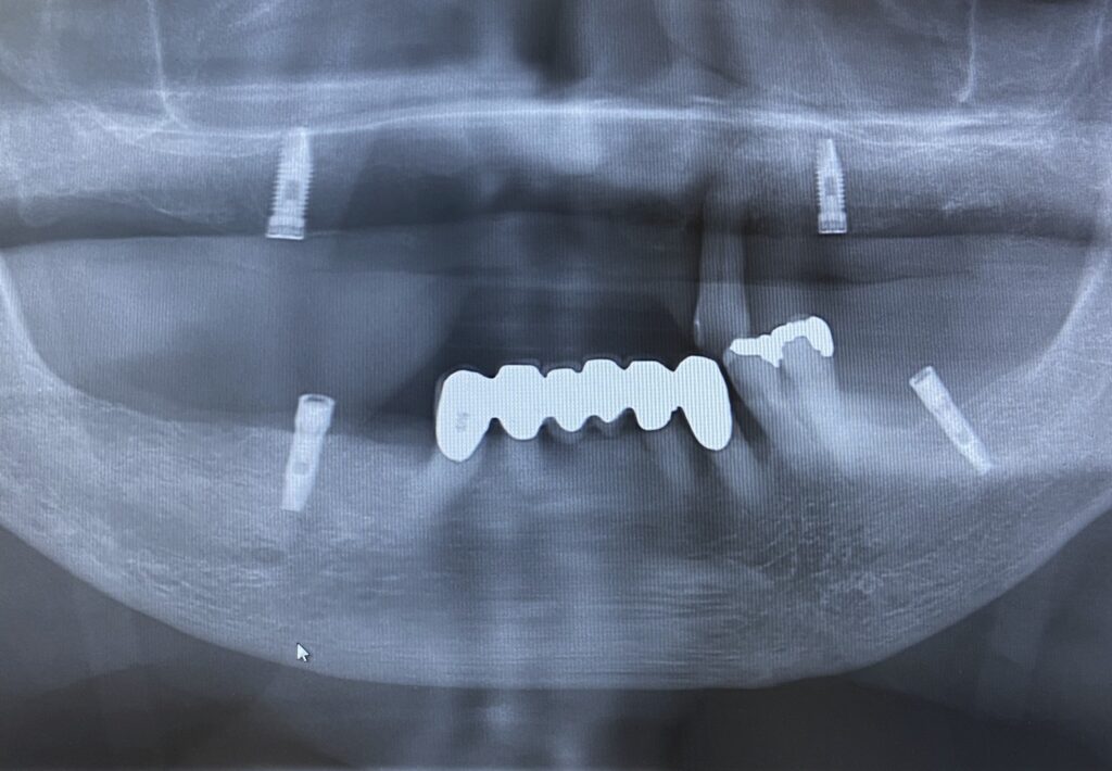 インプラントを正しい方向に埋め込まなかった場合、下顎の骨の幅は薄いので、骨を貫いて、お口の内側にインプラントが入り込んでしまうことがあります。