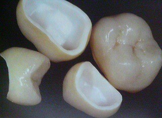 インレーの縁だけでなく、内部にも虫歯が広がっていたら、インレーでの対応は難しいので、さらに広く削って、被せ物にします。