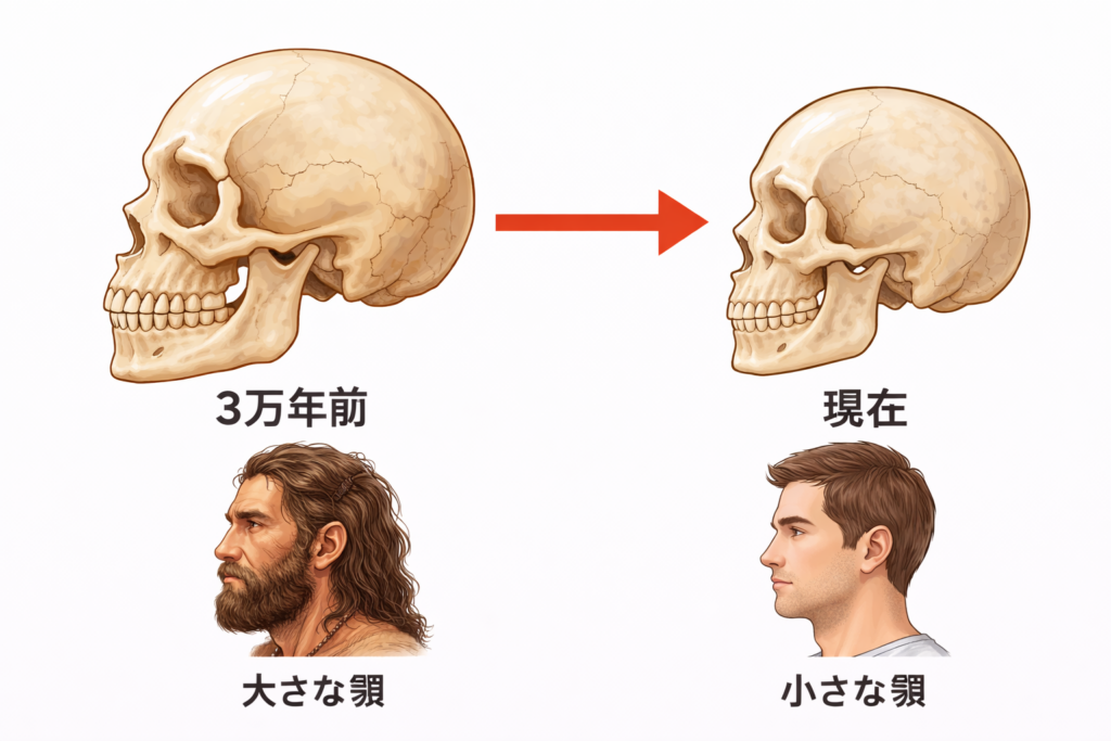 化石を調べると、人類の顎は、3万年ほど前の新人の頃から、急速に小さくなっているようです。